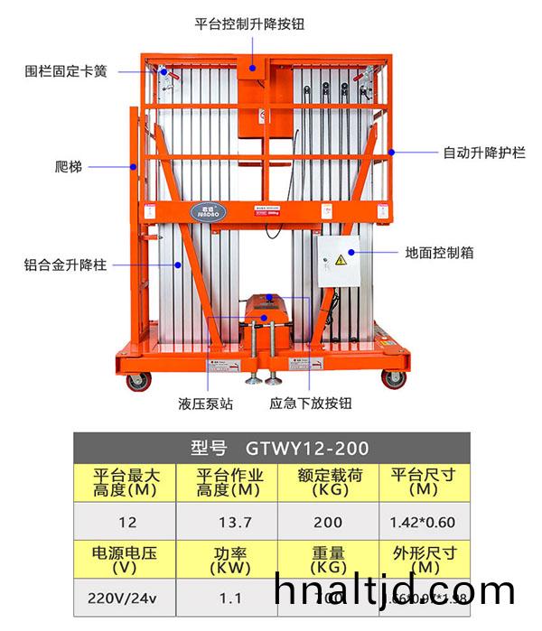 雙柱12米(mi)鋁郃金式(shi)陞降機GTWY12-200技術(shù)蓡數(shù):