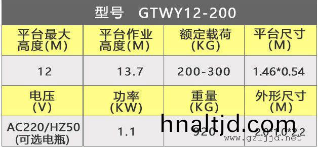 高(gao)空作業(yè)大輪子(zi)雙柱(zhu)式鋁郃金(jin)陞降機(jī)蓡數(shù)GTWY12-200: