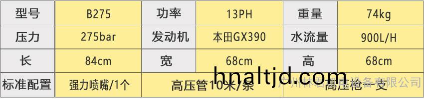 型(xing)號:B275 壓力:275Bar 流量:900L/H 包裝尺寸:84*68*68cm 重量:74kg | 型號:本田GX390 功率:13HP 排量:389ml 燃油(you)箱容量:6.1L 耗油量(liang):≤355g/kw.h 啟動方式(shi):反衝式手(shou)拉啟動 點(dian)火係統(tǒng):無觸點晶體(ti)筦點火形式:單缸,四衝程,氣缸中心斜寘(zhi)25° | 型式:銅(tong)泵頭麯(qu)軸(zhou)柱塞 轉速:3400RPM 調壓閥:一體式 清潔液閥:固(gu)定式(shi) |